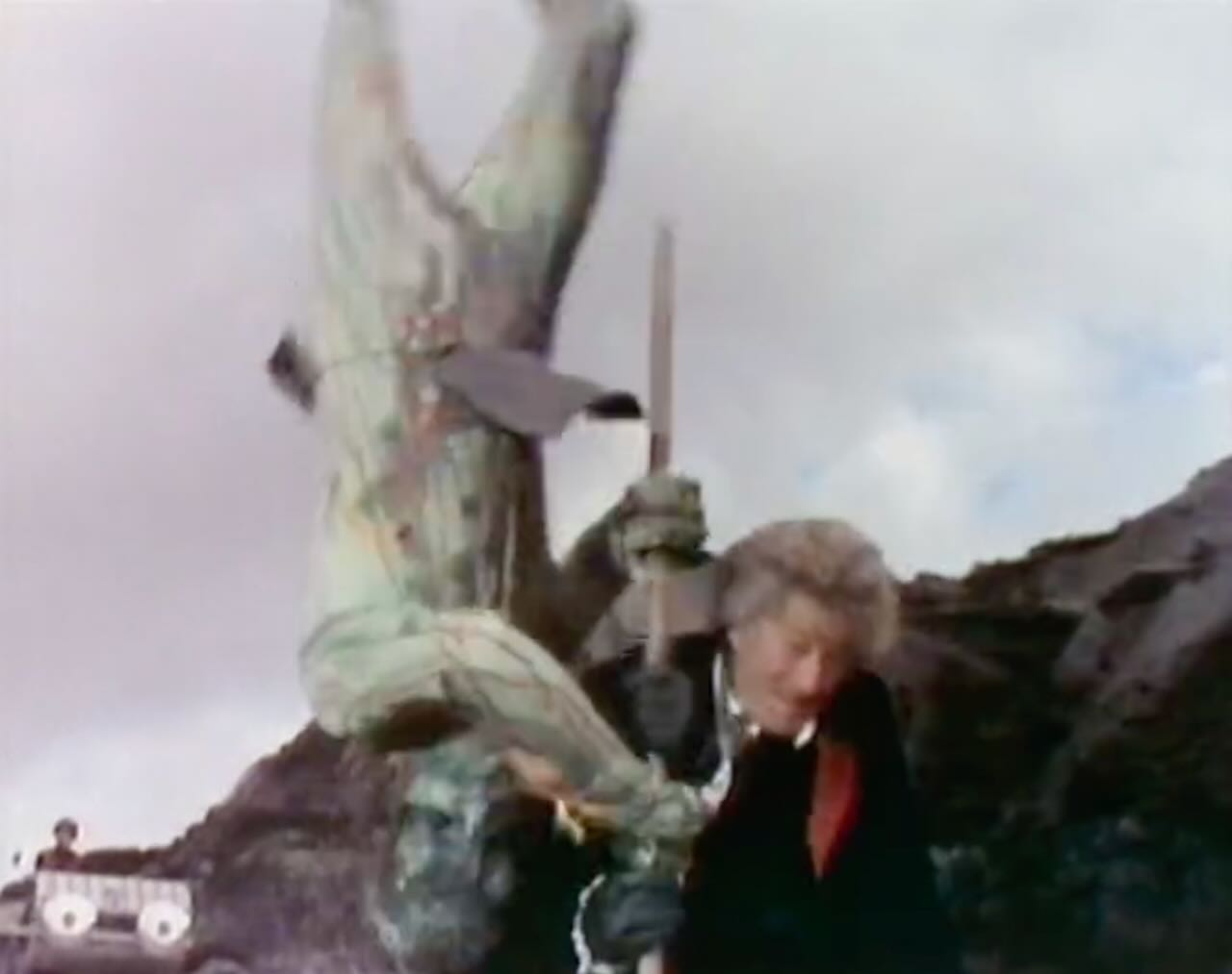 • Jon Pertwee gets a lot of cool martial arts and fight scenes in this story. This might not be too surprising–he tended to relish these sorts of moments, but looking at it now it still felt like a lot. He paralyses Leeson with a poke in the chest, and at various times fights the Master, Morgan and some of the Uxarieans.